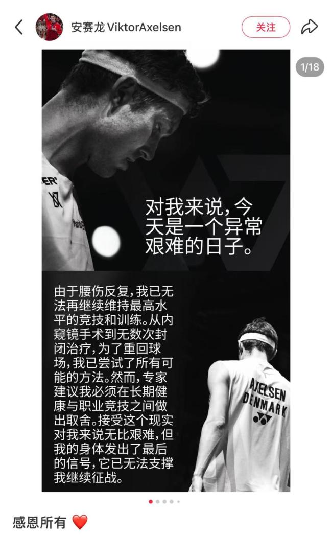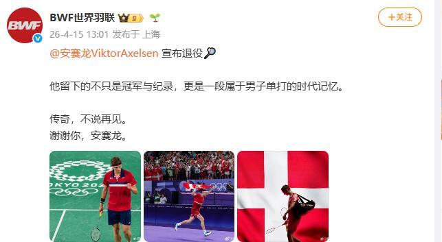 世界羽联也在官方发布了这一消息,并配文称:“他留下的不只是冠军与纪录,更是一段属于男子单打的时代记忆。传奇,不说再见。谢谢你,安赛龙。”