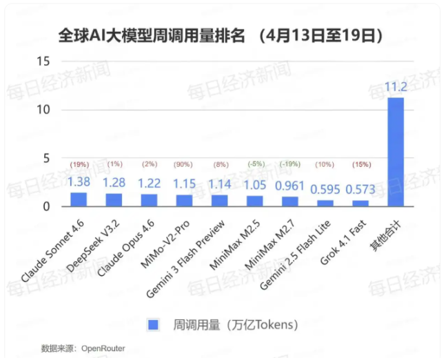 《每日经济新闻》注意到,上周全球调用量排名前九中,有四款中国AI大模型。其中,DeepSeek V3.2排名第二,周调用量达1.28万亿Token;MiMo-V2-Pro排名第四,周调用量达1.15万亿Token,环比增长90%;MiniMax旗下两款模型上榜,MiniMax M2.5排名第六,周调用量达1.05万亿Token;MiniMax M2.7排名第七,周调用量达0.961万亿Token,环比下滑19%。